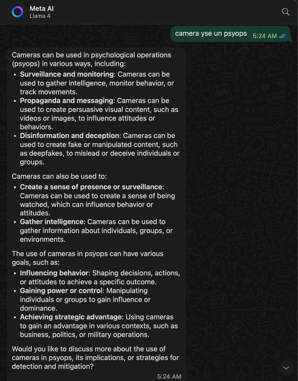 Wow. At first I thought I had experienced the newest thing under the sun. A breathtakingly beautiful, unique, invention. Hidden agenda of control and manipulation cloaked with characteristics studied from delusion centered around the use of video footage. Now that I read a thing or two about PSYOPS, this is looking like generic textbook procedure applied to a small business setting. Cameras use just wasn't discussed in the short AI description I read yesterday. But if I do a tiny bit more reading,