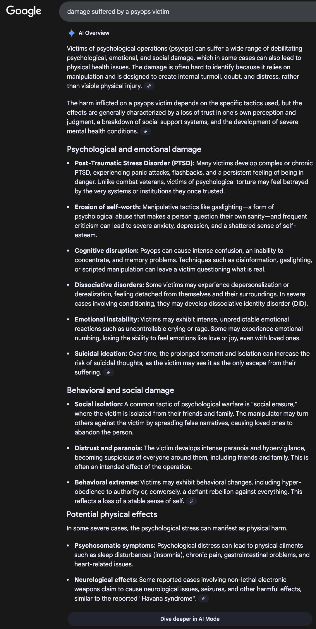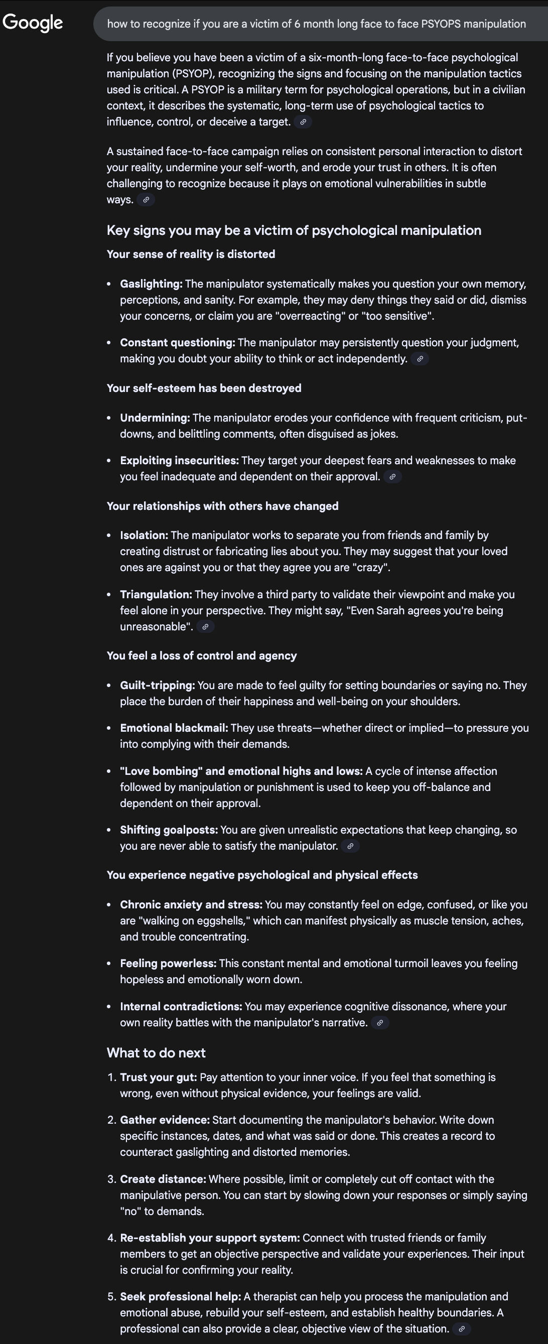 to come to terms with what had happened. Once AI explained PSYOPS in detail to me, my experiences mapped on text book style with the exception of